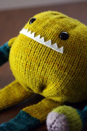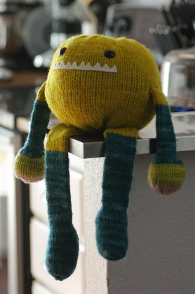 I like the finished style of this cardigan, though I'm not sure the fit is 100% right. I knit the smallest size in the pattern (Child's 4/6) for Camdyn and I'm lucky she was around so that I could try it on her along the way. I'm glad I didn't just go by her normal size (she generally wears a girls 6 or 6x) and follow the numbers blindly because the back of the sweater would have been way too wide. As it is, even after cutting over 3" from the back width the fit is still a little awkward and there is excess fabric across the back and at the underarms. I think in general it looks good enough, and I wasn't about to rip out my work to try to make it better, so this is as good as it gets. I can't really speak to how the larger sizes in the pattern measure up, but for children it seems like it would be hard to knit if the intended recipient wasn't on hand for frequent fittings--and even then in my case I couldn't get the fit quite right. I made a few other minor changes along the way. I had to go up a needle size to get gauge, and I also opted to knit the sleeve ribbing on the smaller needles to bring them in a bit more. As quite a few others have done with this pattern, I knit the sleeves in the round to avoid seaming and omitted the gathered section at the middle back. I also added about 4" to the length of the skirt portion for a longer cardigan. ![]() March 31, 2011 - Posted by Alice SchneblyTony the Toy Box Monster![]() There once was a monster named Tony Project Specs Camdyn actually picked this pattern out from the book for me to make as my second monster. I'm not sure what jumped out at her (maybe it was that he has "toy" in his name?) so even though this wasn't originally one of the patterns I planned on knitting this month, I decided to take her advice and cast on for Tony. I'm glad I did because he turned out super cuddly, and even before he was finished Camdyn was sneaking off with his body and snuggling it as she fell asleep at night.